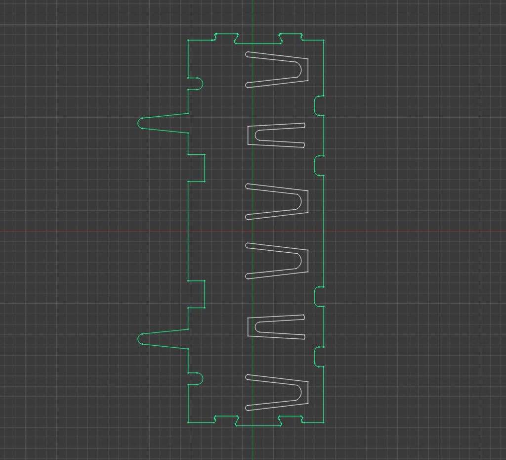 I traced each of the surfaces from the drawing, including the cutouts for the retention tabs. I split the bottom surface along the seam so that the two halves serve as start and end pieces.